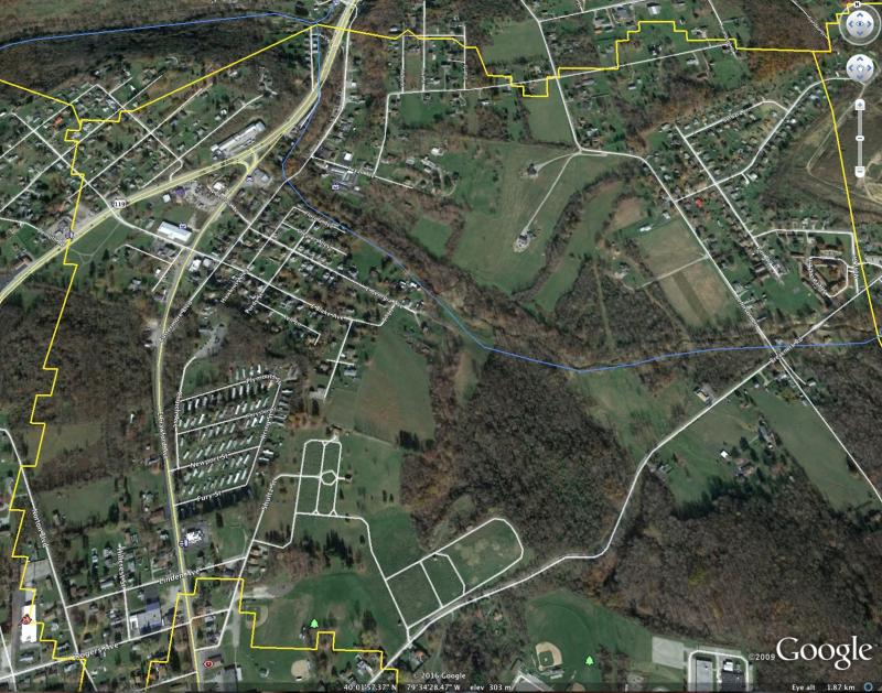 Fig.14 Google Earth view with the yellow lines showing the entire Mounts Creek watershed, including Whites Run and Breakneck Run. The city of Connellsville is in the lower left corner. Fortunately, the heaviest rainfall fell in basins with very low population density, resulting in serious property and road damage, but no loss of life.
